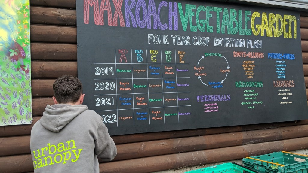 Now in 2020, we are working again with HLP to build a team of ‘Garden Ambassadors’ to help maintain the food growing spaces at the Max Roach centre. Growing Gardeners is a four-part garden skills training programme that we are teaching at Max Roach on behalf of the Healthy Living Platform, to train up a team of people that will help to nurture the garden in future. We’ll be returning for special activity days during the Max Roach Schools Playschemes, and we’ll be on site on the last Saturday of every month to assist the Garden Ambassadors.